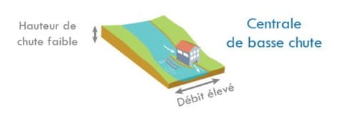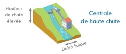 La force dépend soit de la hauteur de la chute d’eau, soit du débit de la rivière. On distingue ainsi 2 types de centrales hydroélectriques :